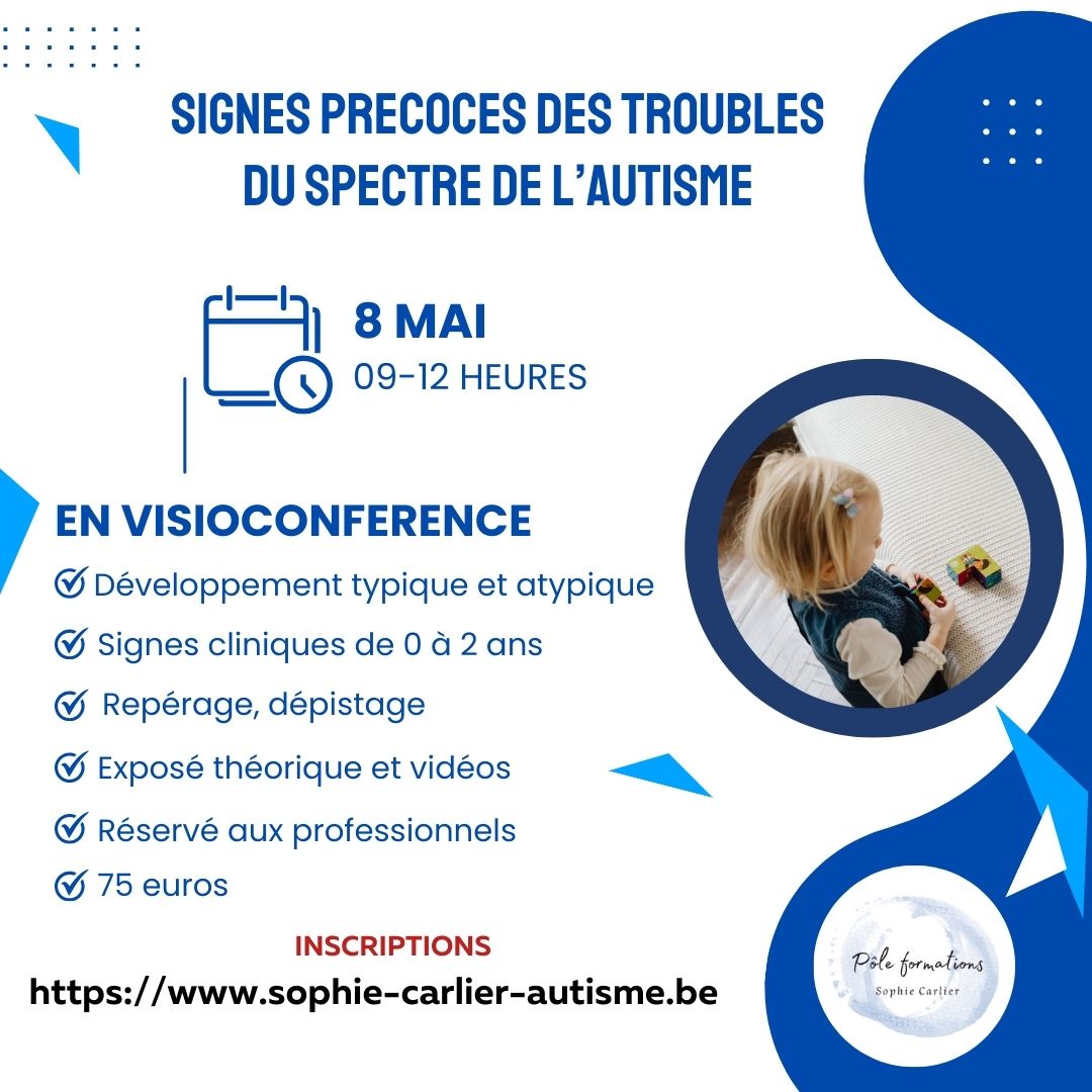 La prochaine formation se fera en visioconférence le 8 mai prochain, de 9 à 12 h, autour du thème des signes précoces de TSA. Inscriptions ci-dessous via le questionnaire à remplir (nombre de places limitées).